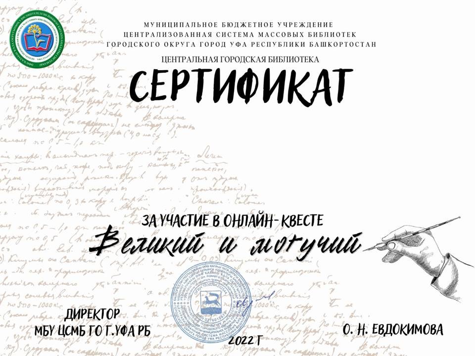 К Международному дню грамотности, Центральная городская библиотека г. Уфы запустила онлайн-квест «Великий и могучий». Квест проходил с 5 по 20 сентября 2022 года на официальном сайте библиотеки-организатора https://ufa-lib.ru/.