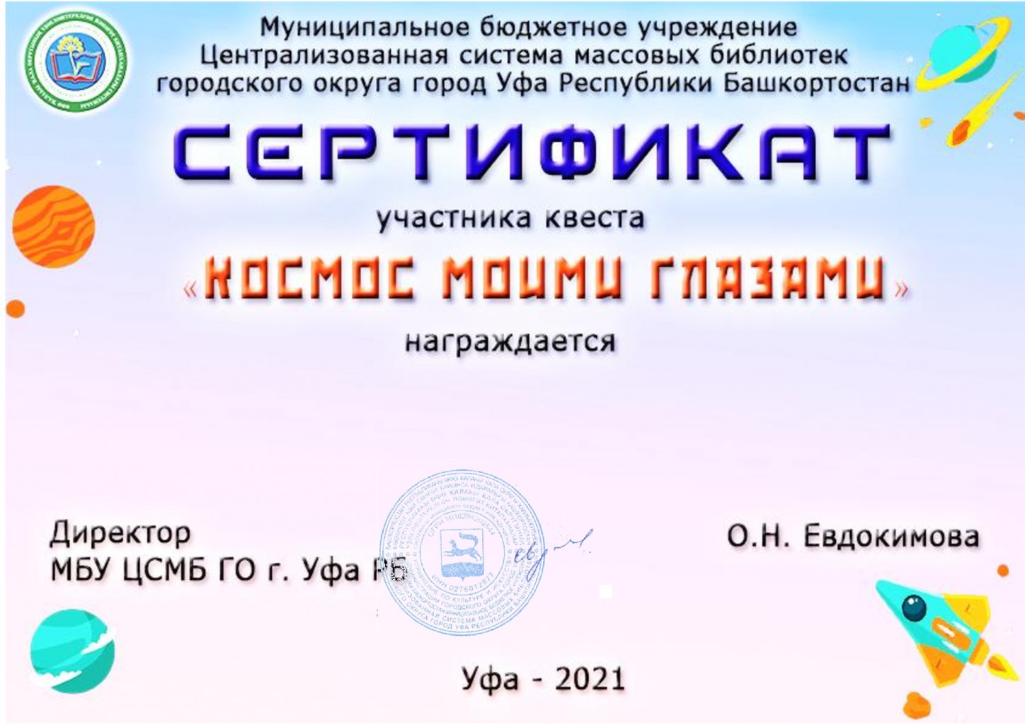 В честь этого знаменательного события, Центральная городская библиотека г. Уфы запустила в онлайн-квест «Космос моими глазами», который прошел на официальном сайте МБУ ЦСМБ ГО г. Уфа РБ