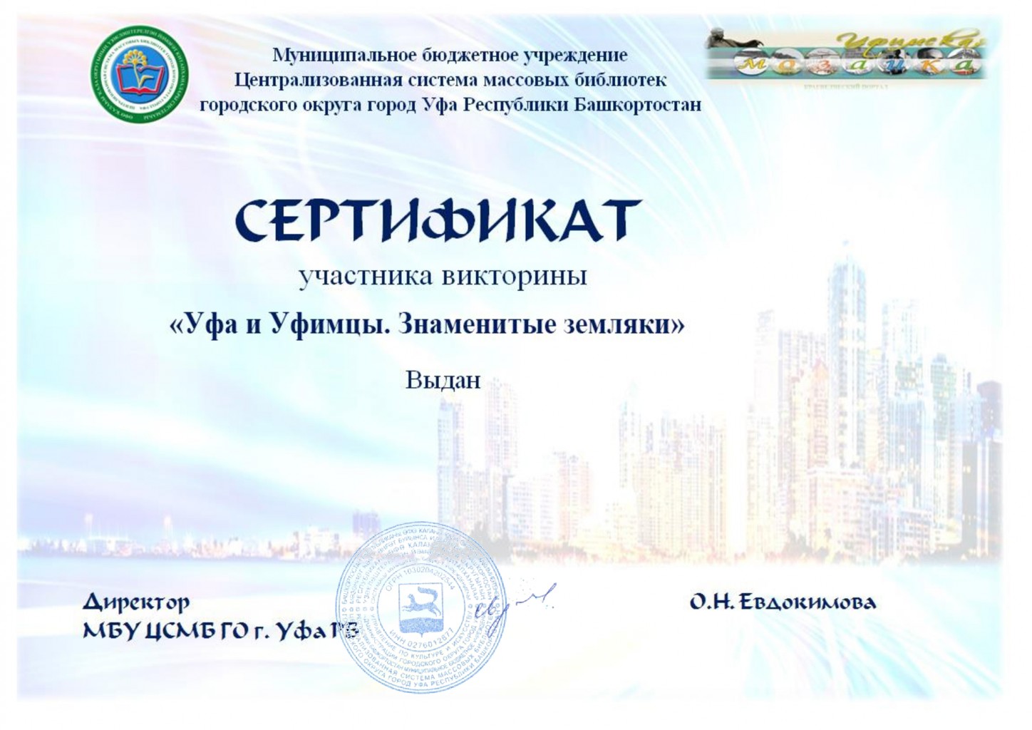 Напоминаем, что участникам, правильно ответившим на все вопросы цикла викторин «Уфа – мой город родной» ко Дню города будет выдан электронный диплом, который будет доступен на официальном сайте МБУ ЦСМБ ГО г. Уфа РБ.