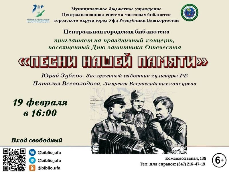 Приближается один из самых важных праздников – День защитника Отечества. И в преддверии этого дня Центральная городская библиотека приглашает вас на праздничный концерт «Песни нашей памяти».