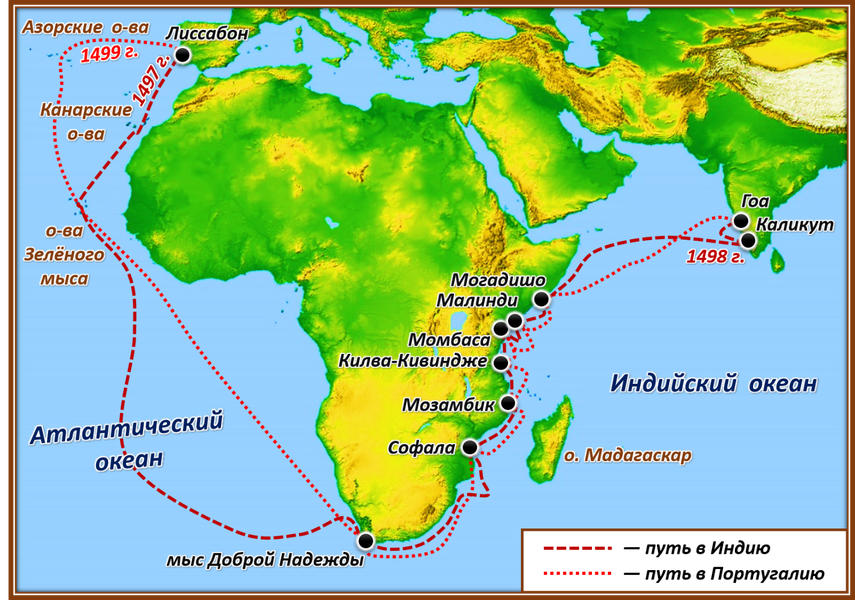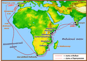 В июле 1497 года экспедиция под началом Васко да Гамы отправилась в плавание на четырех кораблях. Обогнув с юга Африку, 20 мая 1498 года корабли подошли к берегам индийского города Каликут. Так был открыт морской путь из Европы в Индию.
