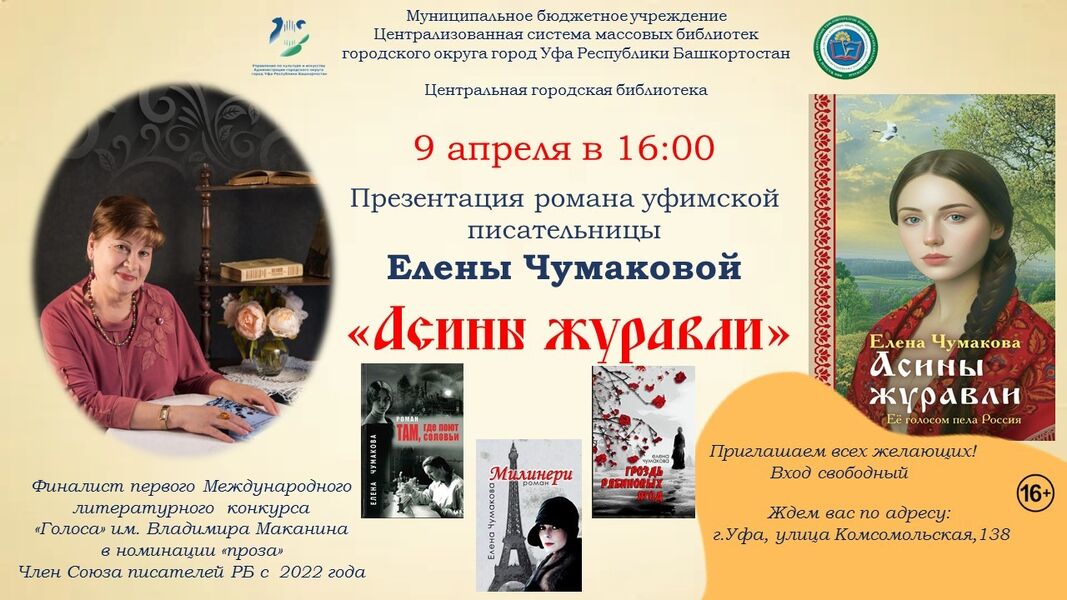 Приглашаем вас на презентацию новой книги талантливой писательницы Елены Чумаковой «Асины журавли». Мероприятие станет настоящим литературным событием для всех ценителей хорошей прозы и глубоких сюжетов.
